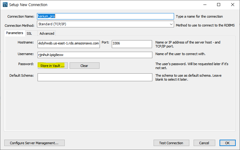 (주의해야 할 부분은 호스트 네임을 커넥션 때와는 다르게 호스트네임:3306/URL주소 이어서 붙이기 라는 점!!)